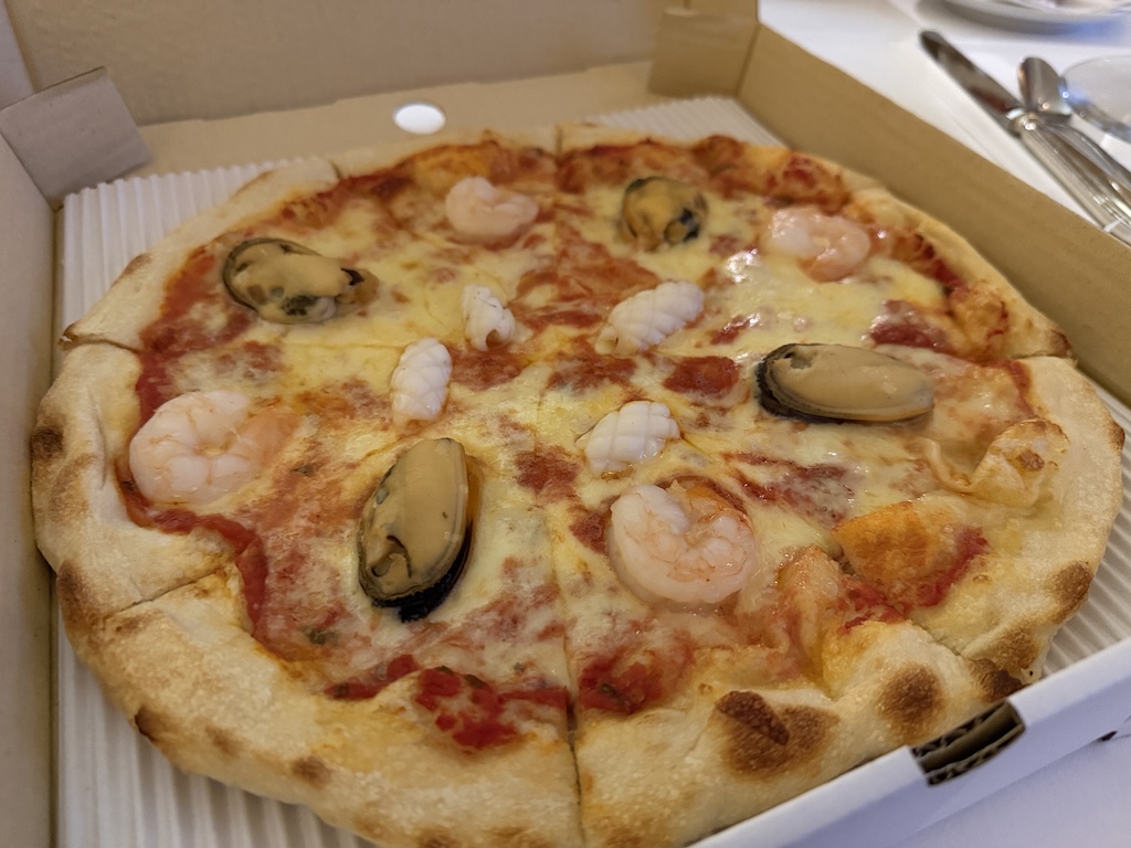ルームサービスって思ったより量が少なくて残念なことあるあるですが、ここのホテルのピッツァはいい意味で期待を裏切ってくる。